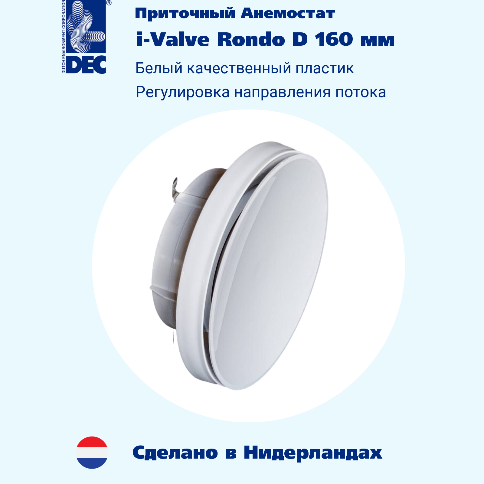 Приточный диффузор i-valve Rondo (доступны диаметры 100- 125- 160 - 200 мм), изготовлен из качественного белого полипропилена, не подверженного выцветанию. В диффузоре предусмотрена возможность регулировки направления потока воздуха. Диффузор может монтироваться на потолок или стену, для удобства монтажа снабжен пружинными стальными клипсами. Изготовлен в Нидерландах на заводе DEC International, поставки в Россию начались в 2021 году.