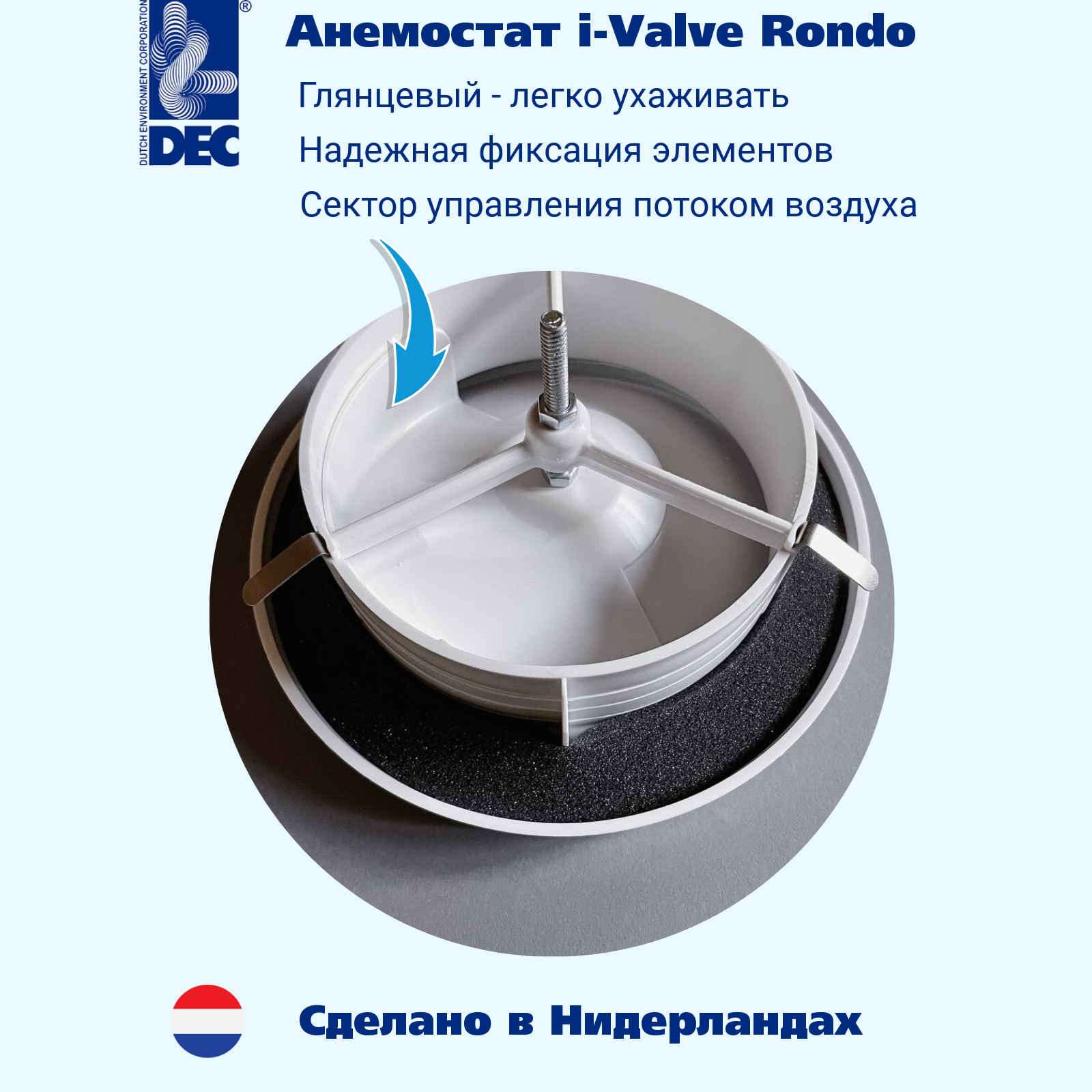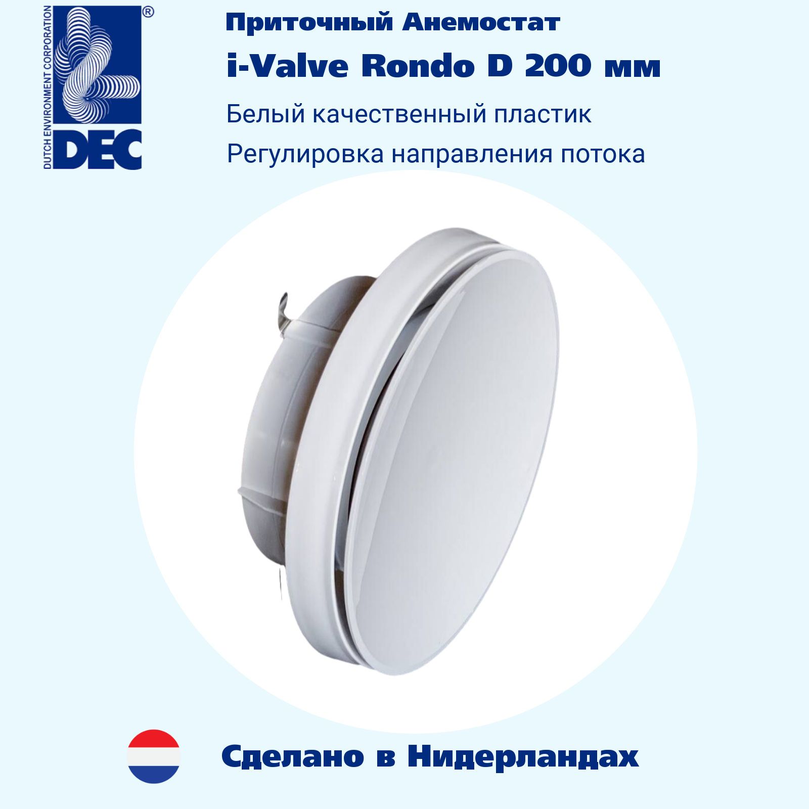 Приточный диффузор i-valve Rondo (доступны диаметры 100- 125- 160 - 200 мм), изготовлен из качественного белого полипропилена, не подверженного выцветанию. В диффузоре предусмотрена возможность регулировки направления потока воздуха. Диффузор может монтироваться на потолок или стену, для удобства монтажа снабжен пружинными стальными клипсами. Изготовлен в Нидерландах на заводе DEC International, поставки в Россию начались в 2021 году.